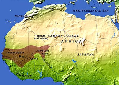 O antigo Reino de Gana, na África Ocidental, desapareceu em 1076 e aí ergueu-se o maior de todos os impérios medievais africanos, o Império Mali. Gana foi-se mantendo sob o governo dos berberes e dos muçulmanos até 1240 quando o rei do Mali, Sundiata Keita, acabou por conquistá-lo. Sundiata era um mandingo, um dos grupos de povos negros que ainda vivem no Mali dos nossos dias.